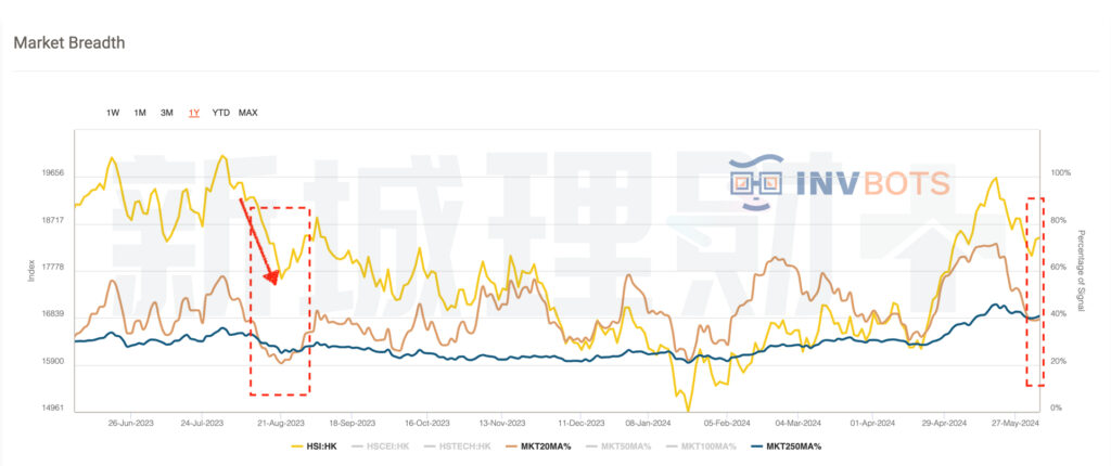 另外,香港市場廣度仍為負,20 日移動平均線百分比仍低於 250 日移動平均線。類似的情況也出現在8月中旬,當時20日移動平均線百分比連續10個交易日低於250日移動平均線,恒生指數在此期間的最大跌幅為1,200點。當這種模式存在時,投資者應保持保守。