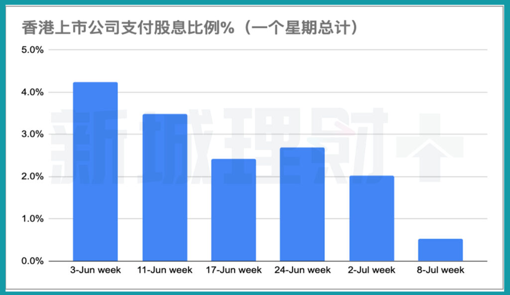 根據統計,6月1日至7月12日的28個交易日,464家香港的上市公司將派發股息,佔香港上市公司總數的15.4%。此外,82 隻恒生指數成分股中的41隻將在這 28 天期間除息。雖然許多美國上市公司每季甚至每月支付股息,但許多中國國有企業和私人企業每年只支付兩次或一次股息。因此,股息支付後股價可能會波動。