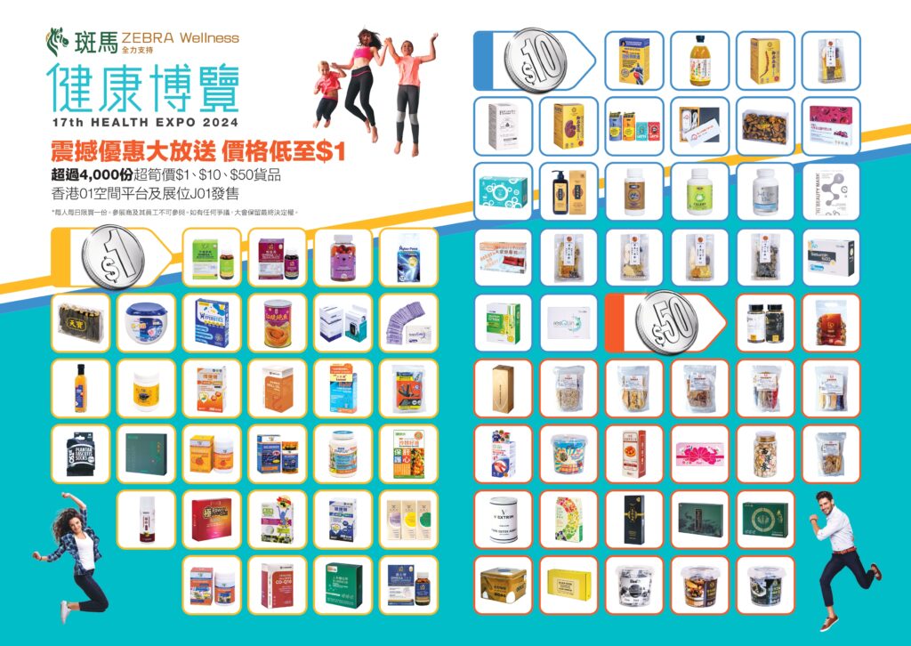 現場震撼優惠大放送,價格低至$1,超過4000份超筍價以以$1、$10、$50 元於網上及現場發售,例如護心寶、羊肚菌、益生菌、靈芝蟲草高麗參、關節通、護眼藍莓素、鹿茸高麗紅蔘、八頭鮑魚罐頭等。