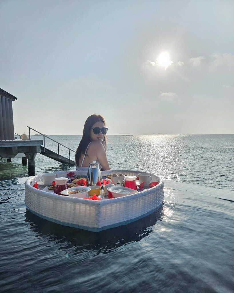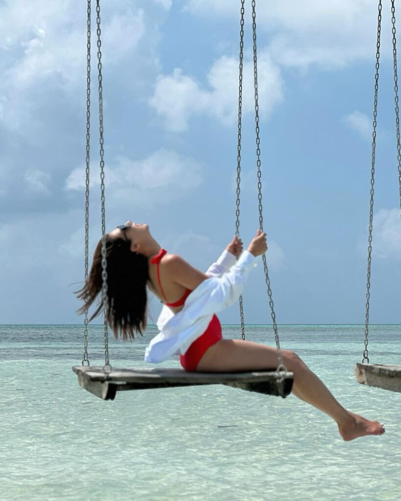 近日嘉欣又再Po出旅行的美照,其中不乏泳衣照。新一輯美照當中見她在泳池邊露出白滑背部,亦有心形早餐籃,十分浪漫。另外也有Po出在海邊穿紅衣三點式盪鞦韆相,早前盪鞦韆的照片中是遠距離拍攝,唔少網民留言寫道想觀看近照,睇嚟嘉欣睇到大家的訴求,不過近距離的照片中就有件白色外套遮住,加上沒有正面照有點可惜,但已經令網民睇到心心眼,這一輯靚相有超過1.5萬讚好。