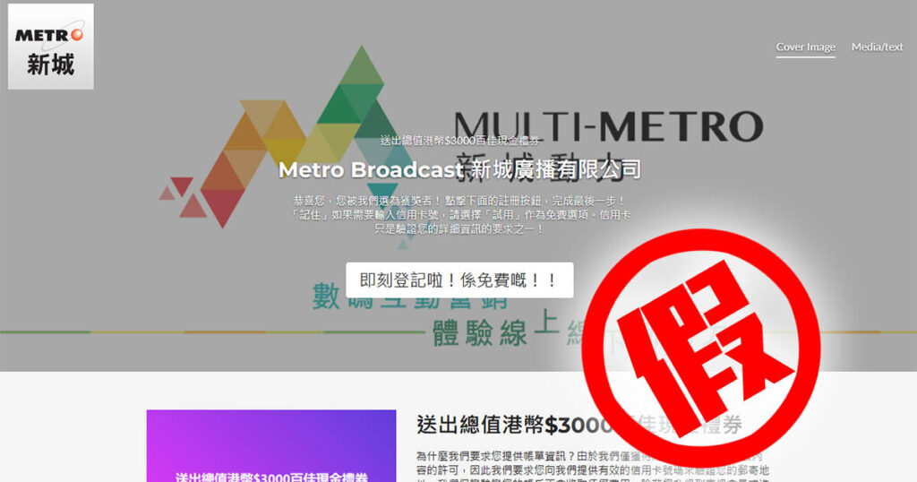 網上騙徒手法層出不窮,有騙徒於新城廣播有限公司Facebook之專頁平台偽冒本公司職員,並偽造新城廣播屬下「Multi – Metro」假網站行騙;在7月13日發佈的「送出總值港幣3000元百佳現金禮券」活動的帖文内回覆活動留言者,並留下連結到冒充「Multi – Metro」假網站,要求留言者提供個人銀行信用卡資料,訛稱通過驗證後,可獲送出以上活動現金禮券,導致留言者有所損失。