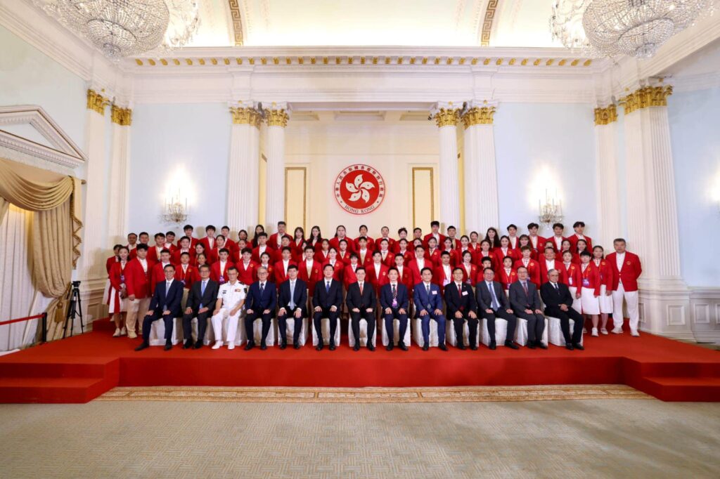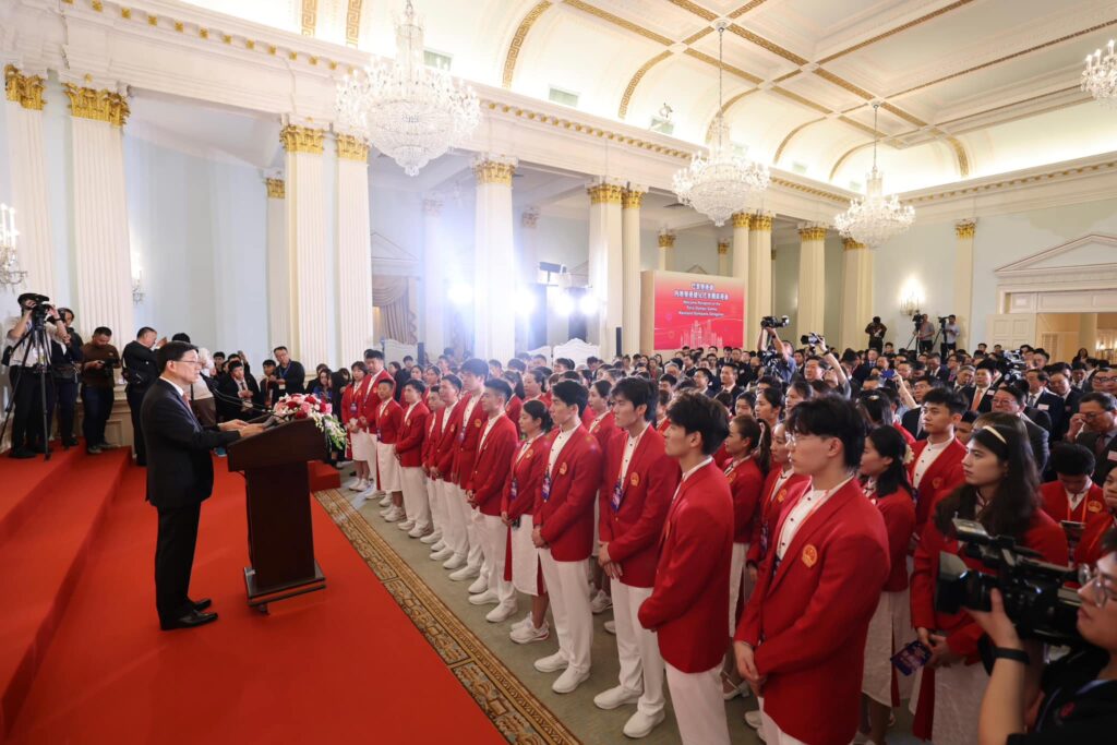 巴黎奧運國家隊代表團抵港訪問3天,特區政府昨日(29日)傍晚在禮賓府舉行歡迎儀式,會上先播放國家隊運動員在巴黎奧運賽事中的精華片段,行政長官李家超致辭時表示,熱烈歡迎代表團出席在禮賓府舉行的歡迎會,他又指市民都非常期待運動員訪港,感謝運動員對香港的支持。