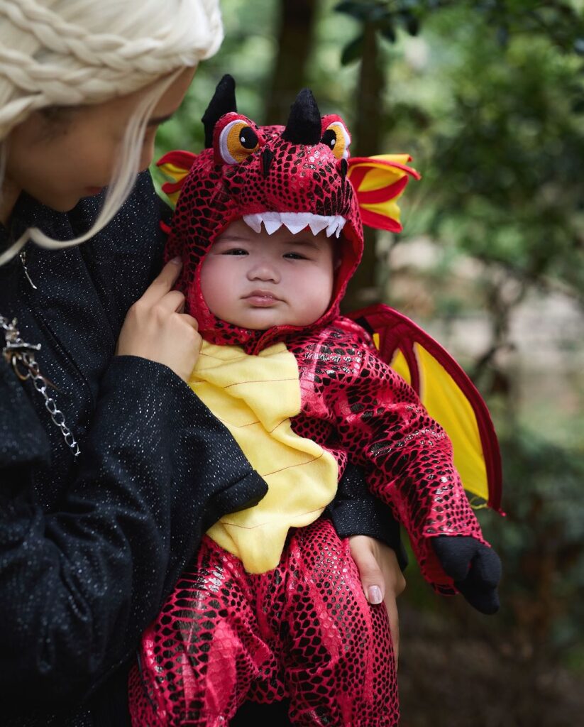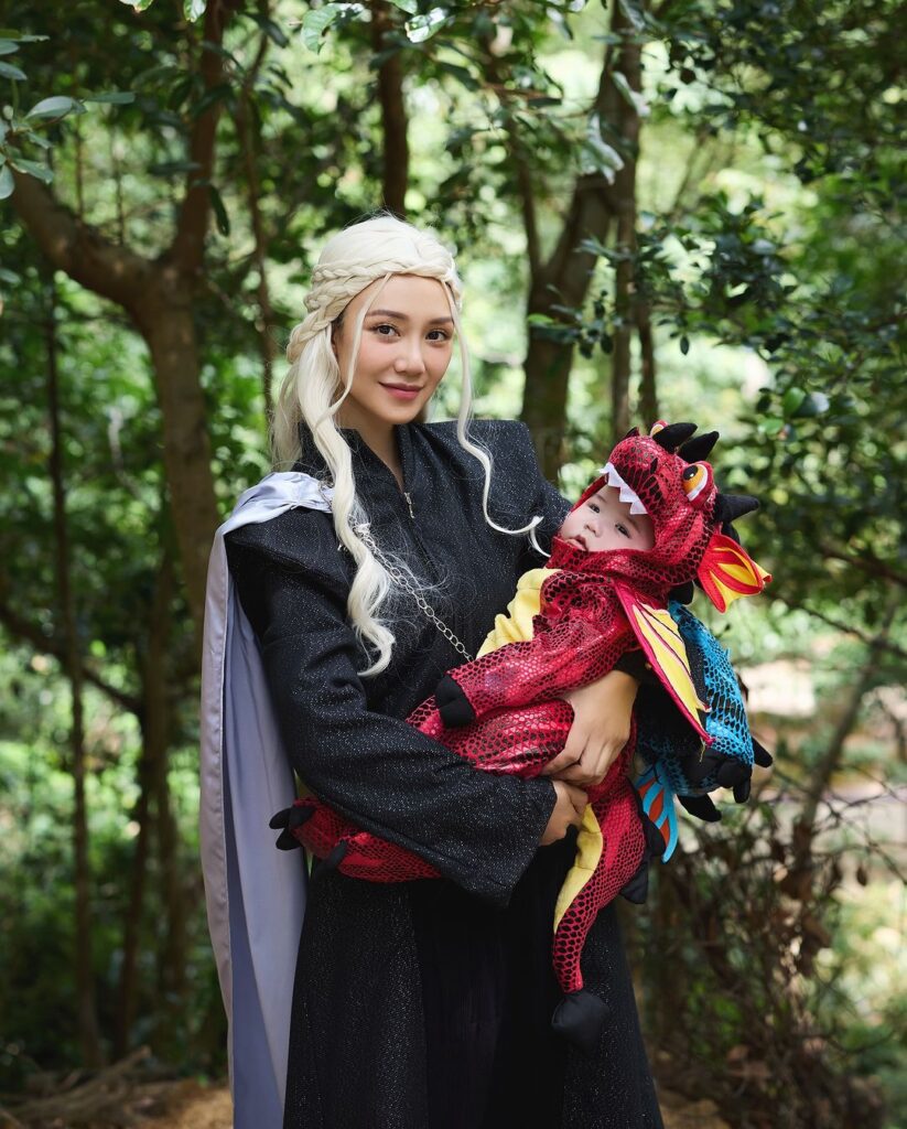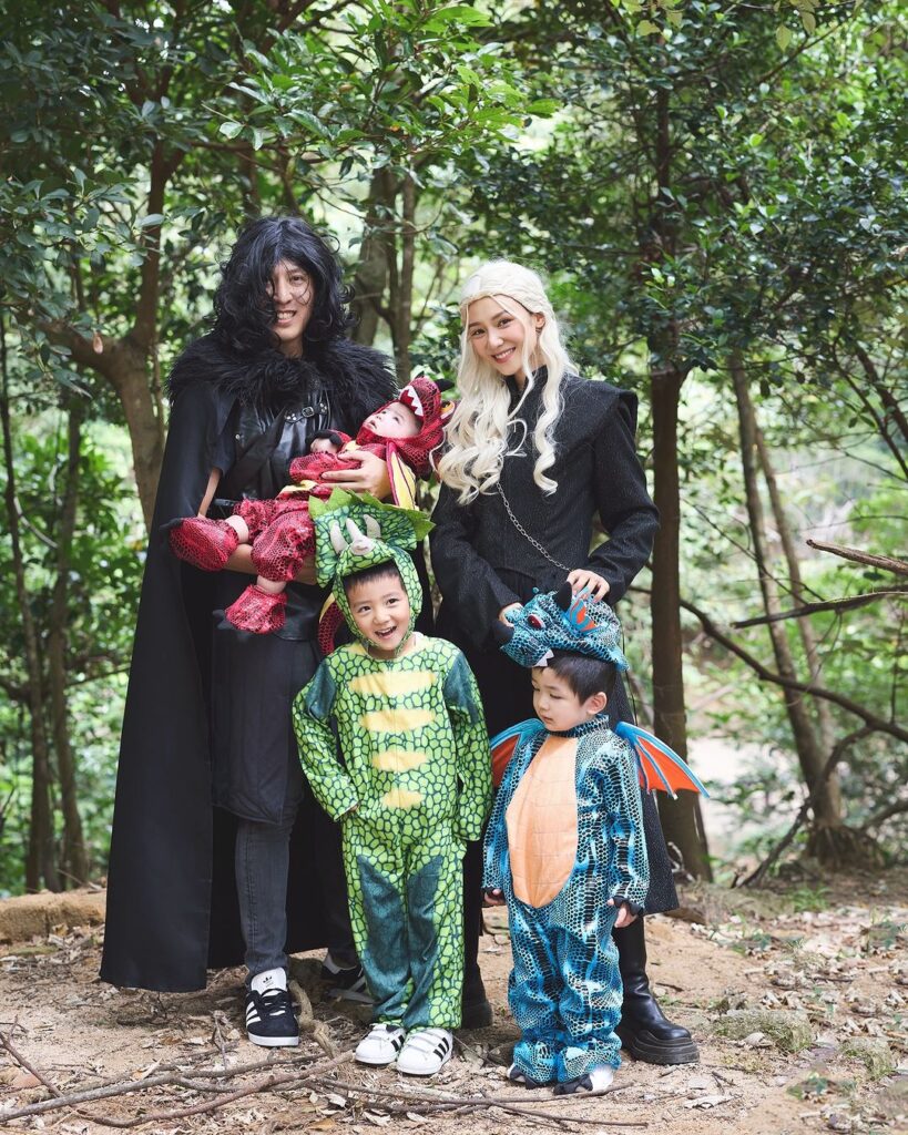 倪晨曦(Elva)一家五口玩《權力遊戲》主題,Elva扮龍母,造型唯俏唯妙,老公則扮Jon Snow,三個仔仔就扮龍,相當有諗頭!她在IG留言說:「估唔到我都有做龍母的一日,因為Nigel是龍年bb,Virgil最近也很喜歡恐龍🦕,Evren只要跟著哥哥什麼都好,所以龍母身邊出現了一隻三角龍,今年game of thrones 的主題非它莫屬。」