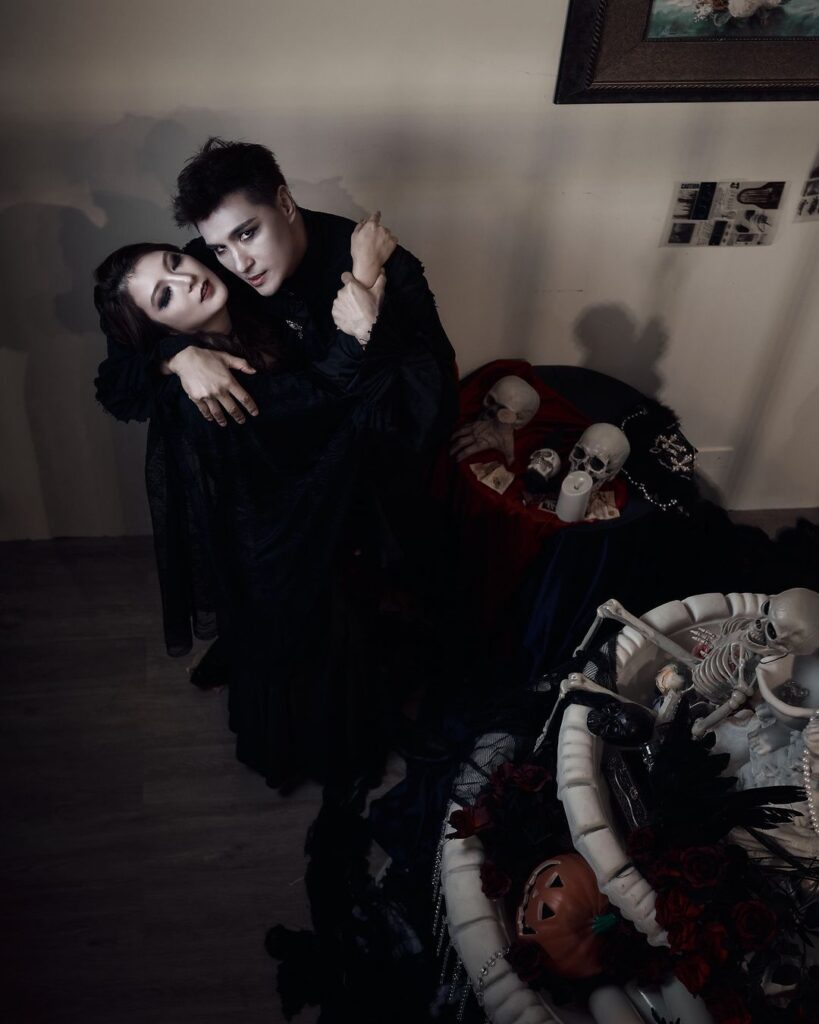 陳展鵬一家三口今年扮吸血鬼,造型唯美!展鵬在社交平台留言說:「細個嘅時候好多人話嘴嘴會生BB,有冇人聽過吸完血都會生BB。」疑似暗示太太單文柔懷孕!