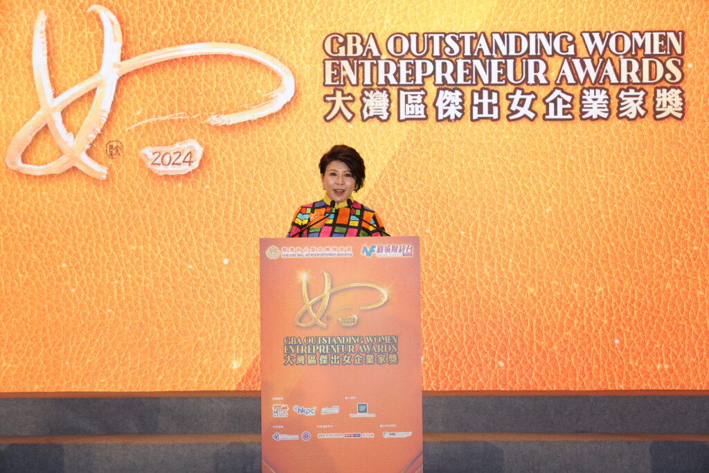 大會聯合主席暨香港中小型企業聯合會永遠榮譽主席 麥美儀女士恭賀各位得獎女士,並祝願各位得獎女企家在未來日子繼續貫徹獎項的棈神,憑著剛柔並濟的本質,繼續發揮優勢,齊創大灣芳華盛世。