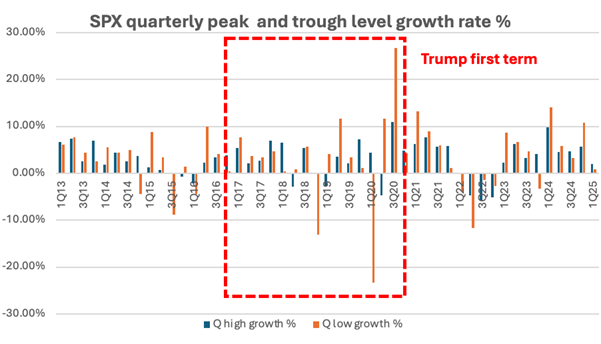 2、第一季出現季度高峰負成長的可能性為20%。然而,過去一季度負增長都沒有發生在周期開始時;相反,它們標誌著負面趨勢的結束(例如 2016 年第一季和 2019 年第一季)。 - 過去三屆政府(2013 年第 1 季、2017 年第 1 季、20 年第 1 季)的新總統任期的第一季始終在 SPX 季度高峰水準上實現正成長率。值得注意的是,2009 年第一季 SPX 高峰季下跌 19%,主要是由於該季度 GDP 下降 6.9%。