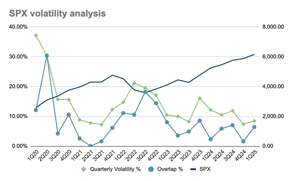 2024 年第 4 季的季度波動率為 7.25%,是過去四年來最低的季度之一(21 年第 2 季和第 3 季分別為 7.21% 和 7.24%)。 2023年至2024年平均季波動率為10.21%。從歷史上看,SPX 往往連續三個季度低於平均波動水平。鑑於 24 年第 4 季的低波動性,我們預計 25 年第 1 季 SPX 波動性將反彈,但仍將低於歷史平均值。