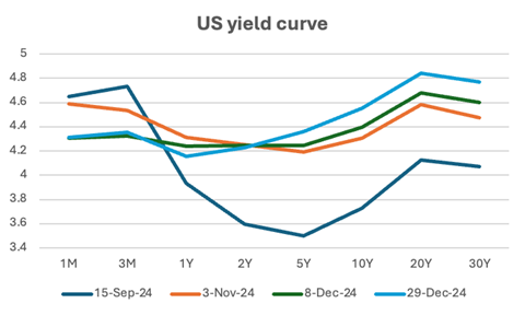 市場越來越關注美國政府的財政赤字和聯儲局的鷹派貨幣政策。在12月份FOMC會議後,美國10年期政府債券利率大幅上漲16個基點,自FOMC會議以來債息率曲線趨陡。 T. Rowe Price 預計 2025 年 10 年期政府債券利率將達到 6%,25 年第一季將超過 5%。長期收益率的上升可能會對股市估值帶來壓力,尤其是房地產和消費必需品等利率敏感產業。
