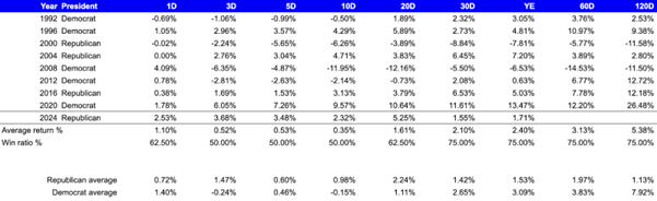 美國大選後,市場已將「特朗普貿易」的許多利多因素納入考量。隨著2024年接近尾聲,投資人開始獲利了結,2024年大選後收益跌破美國大選後收益長期平均。特朗普將於1月20日就職,如果新政府無法及時落實符合市場預期的政策,市場可能會出現調整。