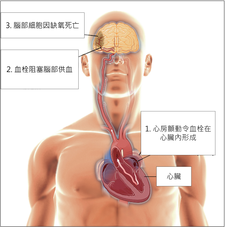 由於心房未能有效地將血液泵出,部份滯留在心房內的血液黏稠在一起形成血栓。一旦血栓流向腦部血管及造成血管阻塞,會令腦細胞缺氧死亡及引致缺血性中風。研究顯示,心房顫動患者的中風風險比一般人高約五倍。所以及早發現,提供適當的治療,是預防中風有效的方法。