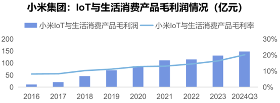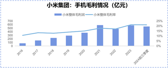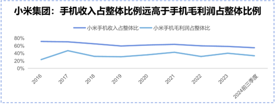 手機業務作為小米集團基本盤,但在利潤端對公司貢獻有限。2016年至2024年前三季度,手機業務在小米集團整體收入的占比持續保持在50%以上,但毛利潤貢獻大多低於40%。