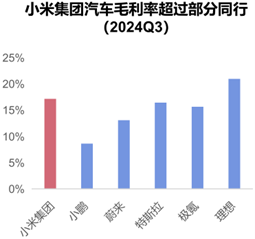 2024年第三季度,小米集團智能電動汽車收入約95億元,毛利率約17%,超過部分同行。2024年,小米集團全年交付超過13.5萬輛,目標2025年交付30萬輛。預計2026年小米集團汽車收入約1774億元。