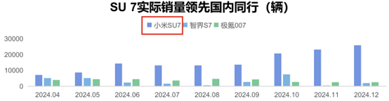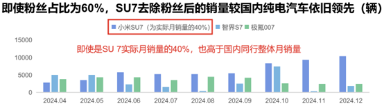 通過對比SU7與國內同類純電汽車銷量,可以發現,2024年4-12月SU7銷量領先同行。考慮到SU7銷量可能受到粉絲的加持,針對SU7銷量進行假設,國海證券認為,即使粉絲銷量占SU 7銷量的60%,SU 7銷量相較國內同類純電汽車依舊領先。