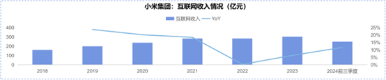 小米集團互聯網收入主要依靠廣告、遊戲等收入。互聯網作為小米集團利潤的主要來源,受益於全球月活躍用戶量的提升,2022年至2024年前三季度業務收入保持穩定增長的狀態。