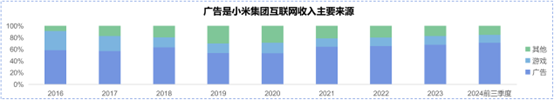 國海證券認為,隨著小米集團硬體產品的提升,疊加高端手機出貨量的提升,小米集團互聯網業績有望進一步增長。2024年第三季度,小米集團互聯網業務收入85億元,創歷史新高。在小米集團互聯網收入中,廣告是主要來源,自2021年起廣告收入占比持續保持在60%+。