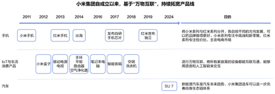 小米集團是一家以智慧手機、IoT平臺為核心的消費電子及智慧製造公司。基於「萬物互聯」的設想,小米集團持續推出多款AIoT產品,並於2024年拓展至新能源汽車領域。集團的發展願景是:通過AI加持,實現人車家全生態發展,致力於成為新一代硬核科技引領者。