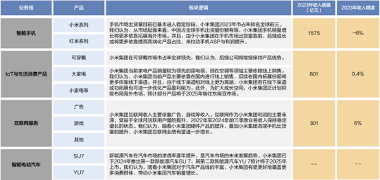 小米集團已於2024年推出第一款新能源汽車SU 7,其第二款新能源汽車YU 7預計將於2025年上市。隨著小米集團對於汽車產品線的豐富,小米集團有望更好地覆蓋更多消費群體,帶動小米集團汽車銷量增長。