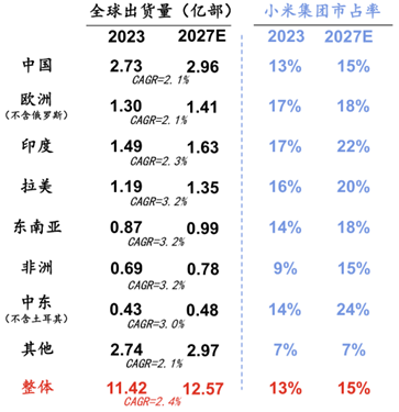 全球手機市場出貨量目前已基本進入穩定發展階段,小米集團2023年市占率排名全球前三。從市場層面來看,中國占全球手機出貨量份額有限,小米集團手機銷量增長將更多依靠拓展海外市場。並且,由於小米集團當前在手機市場出貨量靠前,後續成長或將更多依靠提高高端化產品占比,來拉動手機ASP與利潤提升。
