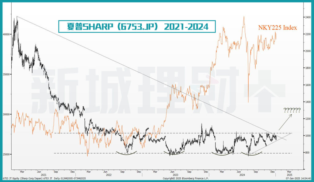 因公司業績一直做不起來,Sharp股價在過去數年日本股票市場火熱的情況下,不單止得不到長期投資者的垂青,筆者認為會有些對沖基金把它視為funding short對象。 話雖如此,筆者觀察到公司股價自2011年到2022年累積90%跌幅後,在過去兩年半一直在Y800至Y1000區域橫行。