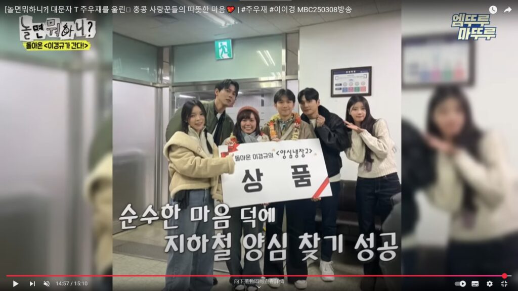兩名旅韓港人因為路不拾遺而意外現身韓國綜藝節目,引起韓國同香港網民嘅熱烈討論。由國民MC劉在錫、HAHA、李美珠等人主持的韓國綜藝節目,每集會去到韓國全國各地進行隨性或企劃性錄製的綜藝節目,每集都會有唔同嘅主題。