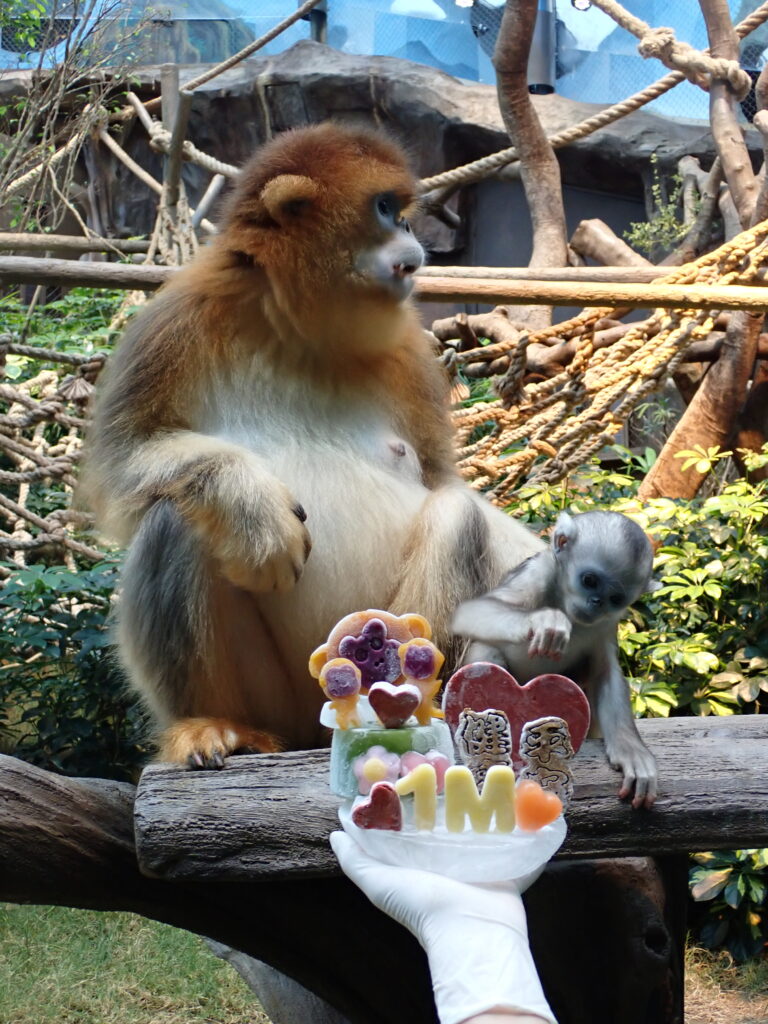 雖然寶寶的牙齒逐漸長出,牠仍然主要依賴樂樂的母乳。護理員為樂樂準備豐富的新鮮樹葉及蔬果,並每日觀察其哺乳次數,確保牠有足夠營養和體力。在慶祝寶寶滿月時,護理員還為牠特製了一個蛋糕!這款蛋糕的主要成分是新鮮蔬果,護理員將水果榨汁後凝固成不同的形狀,讓寶寶在享受美味的同時,也能獲得營養,真是充滿創意的禮物!隨着寶寶慢慢長大,經驗豐富的樂樂將負責教導牠如何進食固體食物,以便逐漸斷奶。