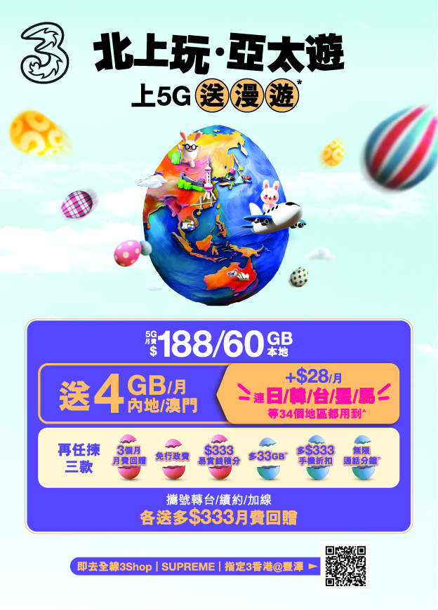 現時只需轉至 3香港 的5G Plan,不僅提供本地5G數據,每月更送4GB漫遊數據,方便北上旅遊同周圍飛。贈送的漫遊數據不僅適用於大灣區,還可升級將數據範圍擴展至亞太地區34個地區,包括香港市民最喜愛的旅遊熱點。旅遊期間無需為購買電話卡或者換卡而煩惱,更快更方便。