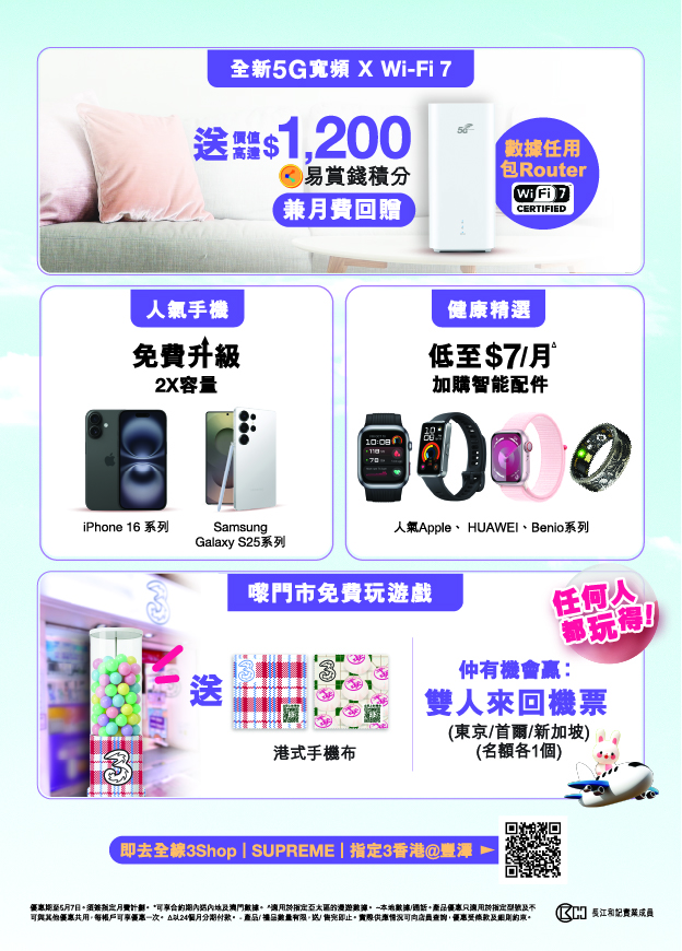 想全家人一齊上網又要夠方便,現在有個更好選擇!插電即用的5G寬頻有全新升級,唔止包Wi-Fi 7 Router,仲有真正數據任用,提供2倍頻寬及4倍速度,全家一齊上網都依然流暢。而家上3香港5G寬頻,送價值高達$1,200易賞錢積分及額外月費回贈。