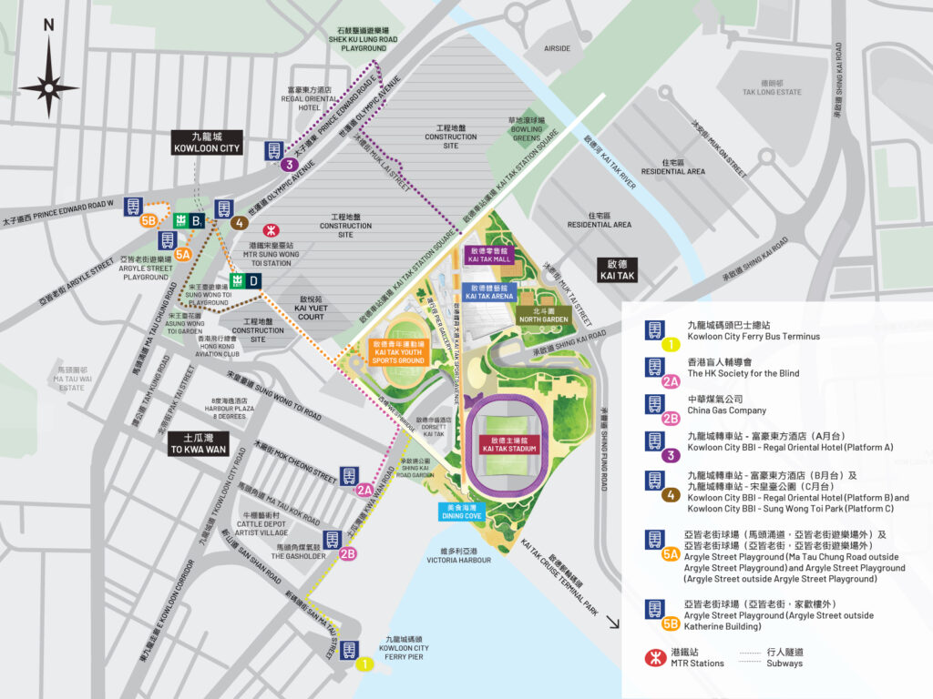 啟德體育園於活動日不設公眾停車位,觀眾可以選擇乘坐公共交通工具到場。港鐵屯馬線至啟德站(D出口)或宋皇臺站(D出口)均可步行至啟德體育園區。啟德公共運輸交匯處、承啟道巴士站或九龍城轉車站(太子道東)亦設有40多條巴士路線。