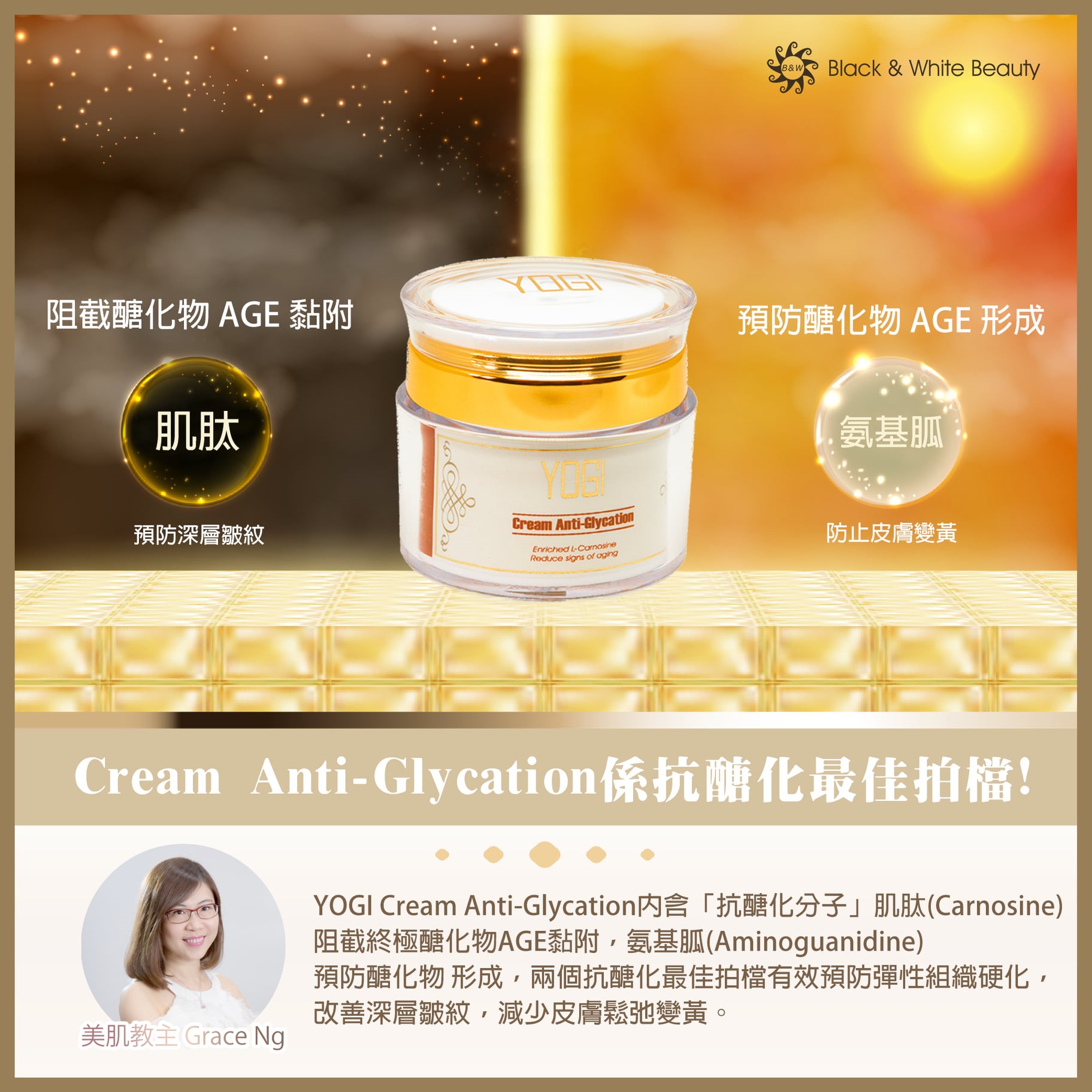 抗醣化不可缺少Cream Anti-Glycation 抗醣化面霜,內含肌肽(Carnosine)成份是「抗化醣分子」,有效阻截終極醣化物黏附到彈性纖維,形成皺紋、皮肉分離的枯黃膚色。配方中的氨基胍(Aminoguanidine)成份阻止「醣化」過程,預防醣化物形成,阻止膠原蛋白被醣化而變黃,避免失去透明感的作用。