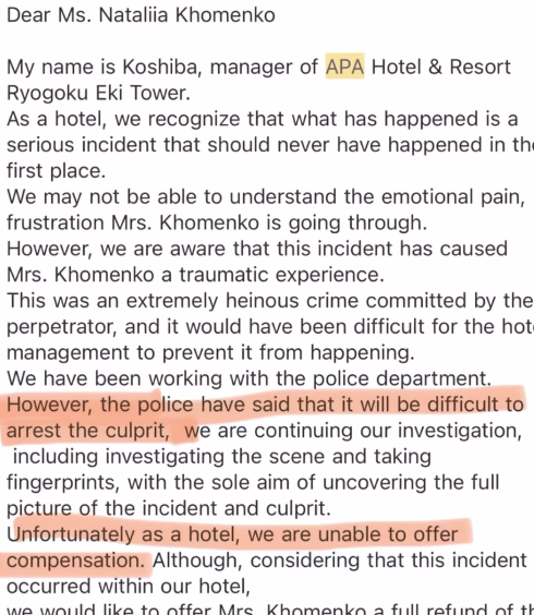 警方到場調查後發現男子於床底遺漏了充電器及USB,估計他已經藏匿多時。酒店則指因為未有設置CCTV,所以無法找出該名男子是誰。Natali因此事出現焦慮症狀,導致無法入睡。她亦有向她訂房的平台要求全數退款,但對方只是賠償了178美元優惠券。她最後親自向酒店要求,才獲得全數的退款。