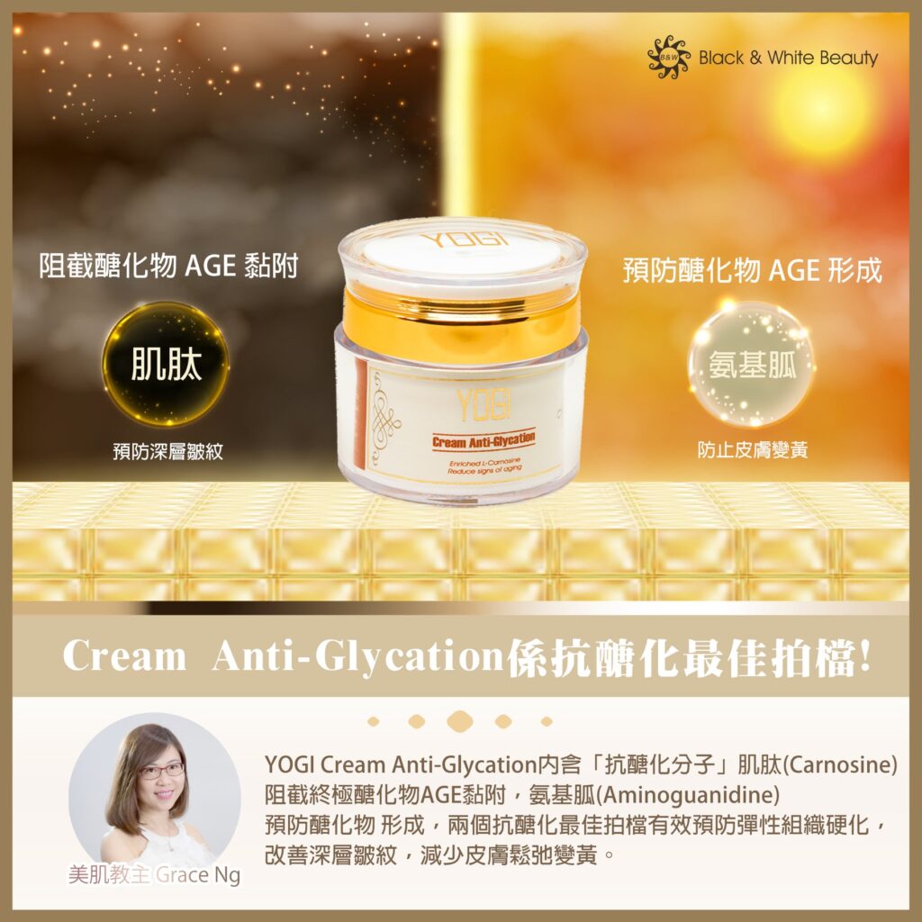 抗醣化面霜(Cream Anti-Glycation)內含肌肽(Carnosine)成份是「抗醣化份子」,阻截終極醣化物黏附到彈性纖維,形成皺紋、皮肉分離、枯黃膚色。配方中的氨基胍(Aminoguanidine) 成份阻止醣化過程,預防醣化物形成,阻止膠原蛋白被醣化而變黃,避免失去透明感的作用。Carnosine及Aminoguanidine,一個阻止黏附,另外一個預防形成,是抗醣化最佳拍檔。