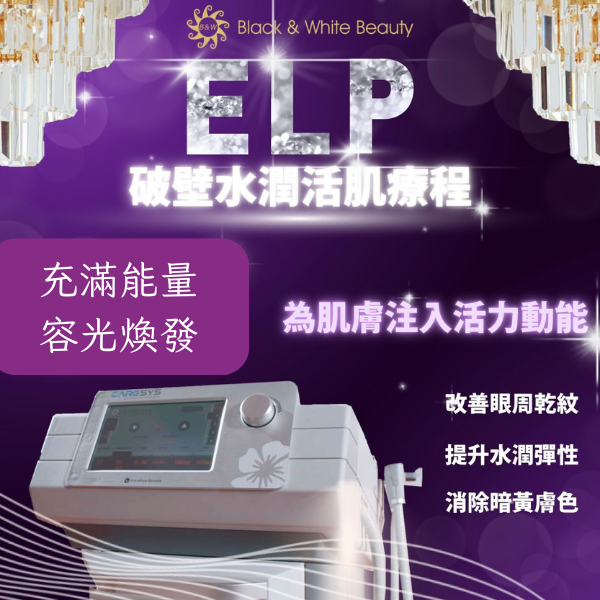 ELP 破壁水潤活肌療程為肌膚充電的同時,亦會分別以溫暖和清涼温度交替進行,令微細血管有秩序作舒張收縮運動,改善血管彈性,增加運送營養及排走癈物。當中配合的穴位刺激,減輕令肌膚負擔,倍效提高肌膚活力動能。