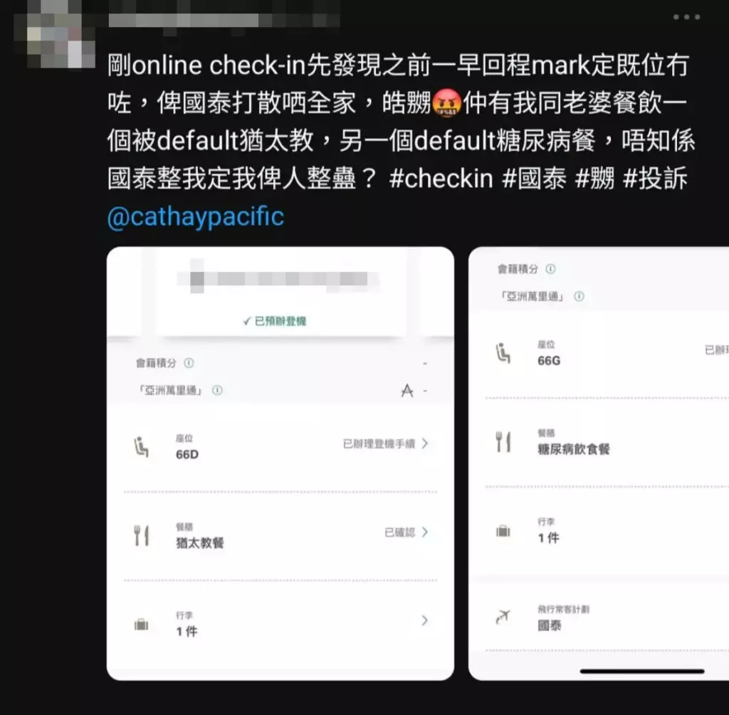 一名父親近日與太太及女兒到日本旅遊,但發現回程時的航班座位有所變動,餐飲亦被設定為猶太教餐及糖尿病飲食餐。因此於網上發文投訴航空公司,他指「唔知係國泰整我定我俾人整蠱」。後來發現原來是因為他出發前做了一件事,以致被網民惡作劇。