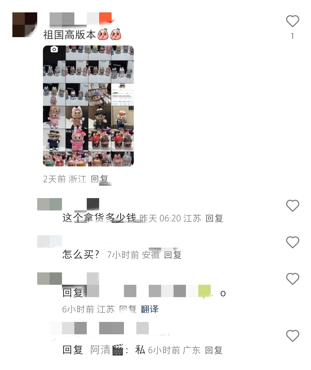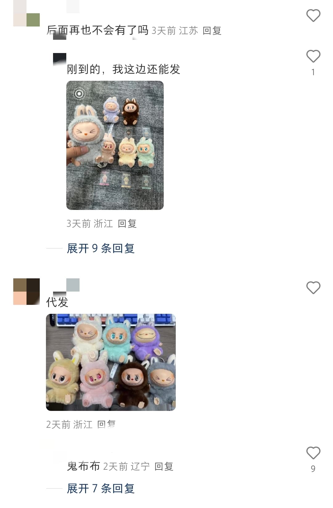 雖然義烏實體店的翻版Labubu已被嚴打下架,但有商家表示「工商這幾天嚴查」,雖然不會明目張膽上架,但實際上暗中仍有交易。與「義烏市場Labubu下架」相關帖文的評論區中,仍有不少來自全國各地商家的賬號留言,稱自己仍可以發貨。