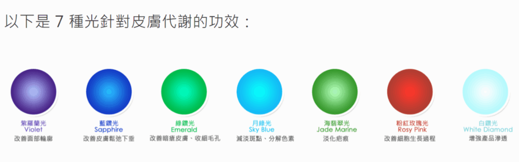 - 紫羅蘭光(Violet)配合藍鑽光(Sapphire)有助養護膠原蛋白的代謝;