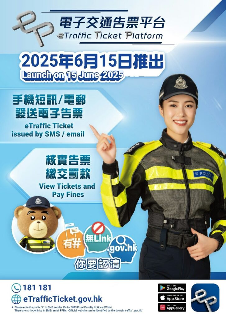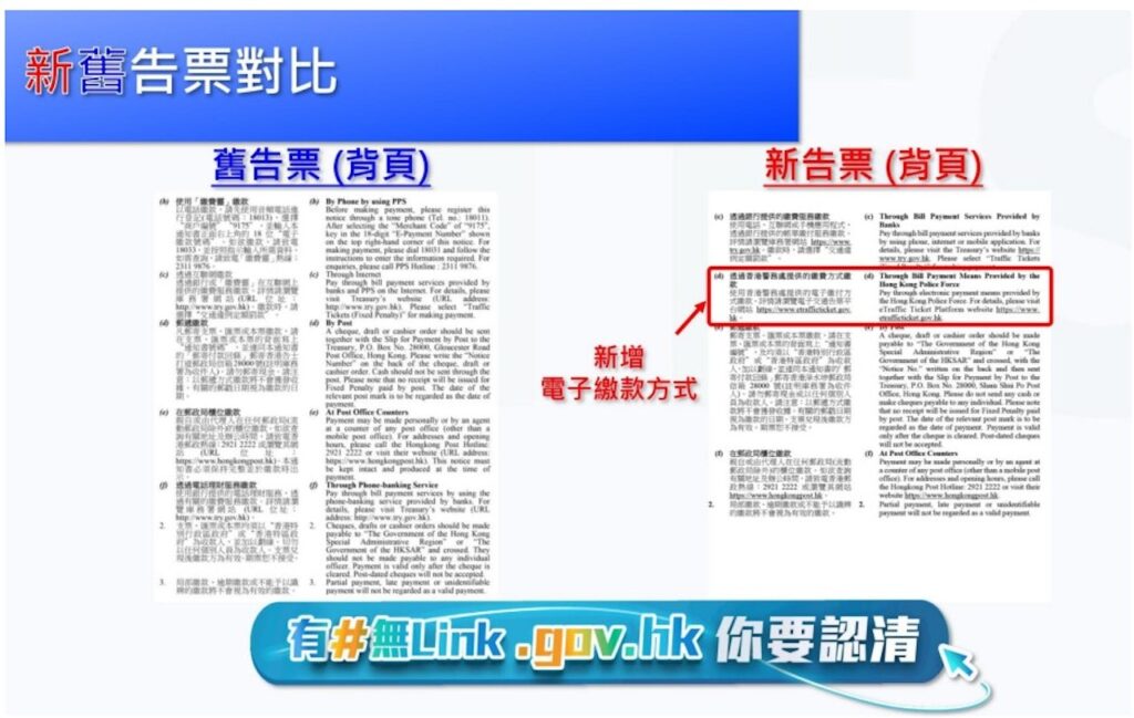 3. 無論是短訊或電郵告票,警務處均不會在電子告票附有任何超連結(Hyperlink)。警方呼籲市民如果收到疑似短訊或電郵告票包含超連結,務必提防,切勿按下連結或提供任何個人資料。