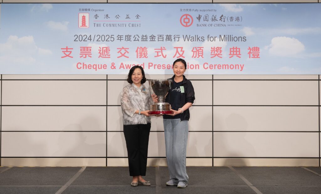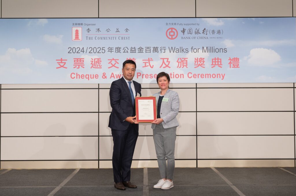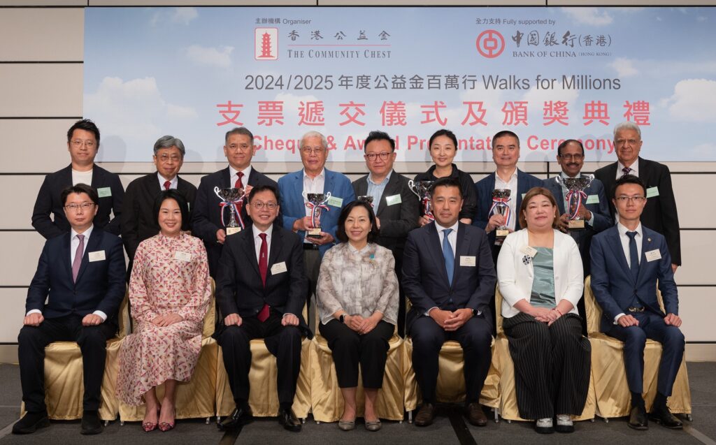 為了感謝社會各界的踴躍支持和多個政府部門、機構及制服團體的鼎力協助,公益金於 5 月 23 日舉行 2024/2025 年度公益金百萬行支票遞交儀式及頒獎典禮,民政及青年事務局局長麥美娟女士擔任主禮嘉賓,聯同公益金籌募委員會聯席主席孫道弘先生及百萬行籌劃委員會委員於典禮上頒發各個獎項予得獎機構、團體及個人支持者,以及致送紀念品予贊助及協助機構及團體。