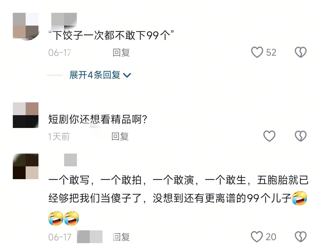 網民對該短劇的荒誕情節紛紛表示「下餃子一次都不敢下99個」、「一個敢寫,一個敢拍,一個敢演,一個敢生,五胞胎就已經夠把我們當傻子了,沒想到還有更離譜的99個兒子」