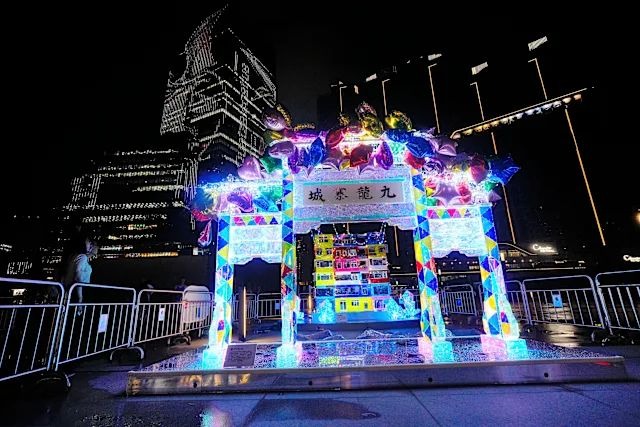 該燈飾展由九龍城區各界慶典委員會舉辦,九龍社團聯會合辦,燈飾展其中有兩個裝置是以九龍城寨為主題,橫匾寫上「九龍城寨」的牌坊,以類似錫紙及彩色玻璃紙的物料製成,呈現一幢大廈外牆模樣,外牆有多個招牌,例如「龍城診所」、「寨城理髮」、「寨城飯店」,底部有一條白色的樓梯。兩個裝置均超過兩米高,底部鋪設電線及燈具。