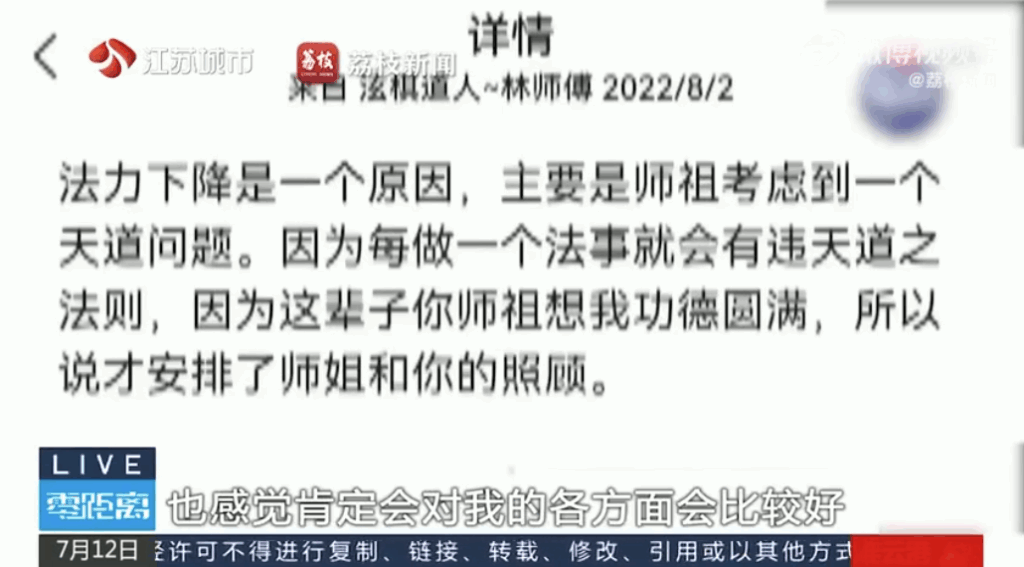 內地一名王女士因長期受到失眠的困擾,在網上認識到一位自稱「泫棋道人」的林姓男子,更被其收為弟子,5年之間不斷轉賬的金額竟高達94萬,直至被丈夫查看手機之後才發現,但王女士卻仍然感覺自豪,覺得自己供養一個神仙對自己各方面都會帶來好處。