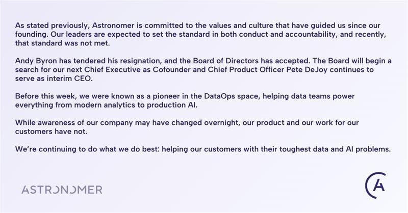 Astronomer於事發後兩日在LinkedIn發表聲明,指公司要求領袖達到操守和問責標準,顯然最近有領袖未達標準。Andy Byron 已提出請辭,並獲得董事會接納,目前已展開新CEO招聘程序。Astronomer聲明上未提及事件中另一名高層Kristin Cabot的去留。