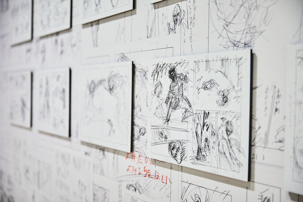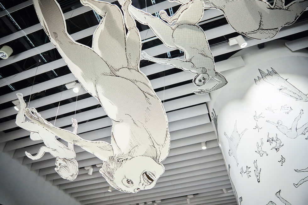 【原畫的世界2「衝突與死鬥」】巨大的原畫巨人從天而降還原動畫當中充滿壓迫感的場景,同時又因為原畫黑白的綫條感,有種突破次元,從漫畫世界跳出來現實世界的感覺。作者諫山創表示「希望大家能看到在漫畫中因為印刷而看不見的部分, 像是重複塗白修正的地方,就某種意義上,我覺得原稿就像是立體物一般。」因此入場的大家可以多加留意小細節。