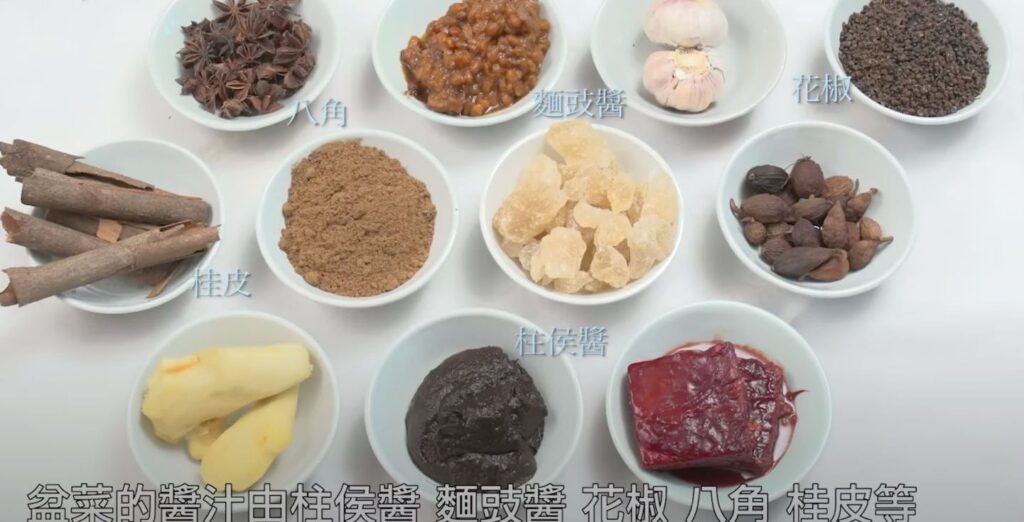 其中不可或缺的靈魂就是「南乳炆豬肉」。南乳汁並非單一調味,而往往需以十多種香料調製,方能達至濃厚深邃的味道。肥瘦相間的豬腩肉,經過長時間炆煮後,把南乳的甘香完全吸收,入口軟糯入味,成為整個盆菜的核心所在。