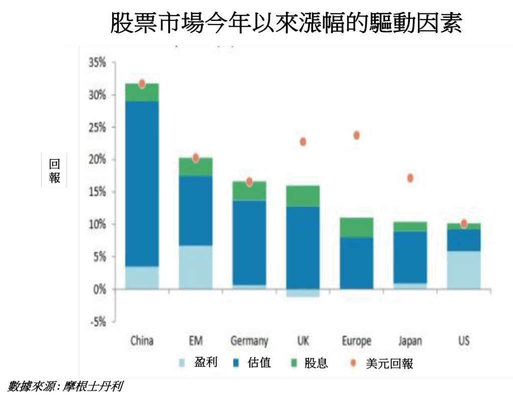 從上圖不難看出,驅動股票市場表現的因素有三,第一是上市公司盈利增長,其次是上市公司股息分紅,第三就是市場願意給的估值改變(估值重估) 。今年表現神勇的MSCI中國股票,當中的驅動因素超過8成來自於估值重估,這個大拐彎,由”來世不投香港股”的市場極度悲觀情緒轉變成基金公司趕快發行基金以免摸頂的局面當中可見一班 ! 反觀美股,由於市場估值已經處於歷史高位,因此,今年以來的市場升幅,超過一半是來自於公司盈利增長,充分反映市場再往上推的難度。筆者相信,由估值重估因素所帶來的上漲空間已經相當有限,往後的升幅必須來自於上市公司,特別是龍頭上市公司的新盈利增長點。這個”劃大餅”過程既有趣又兇險,大家要做好功課 !