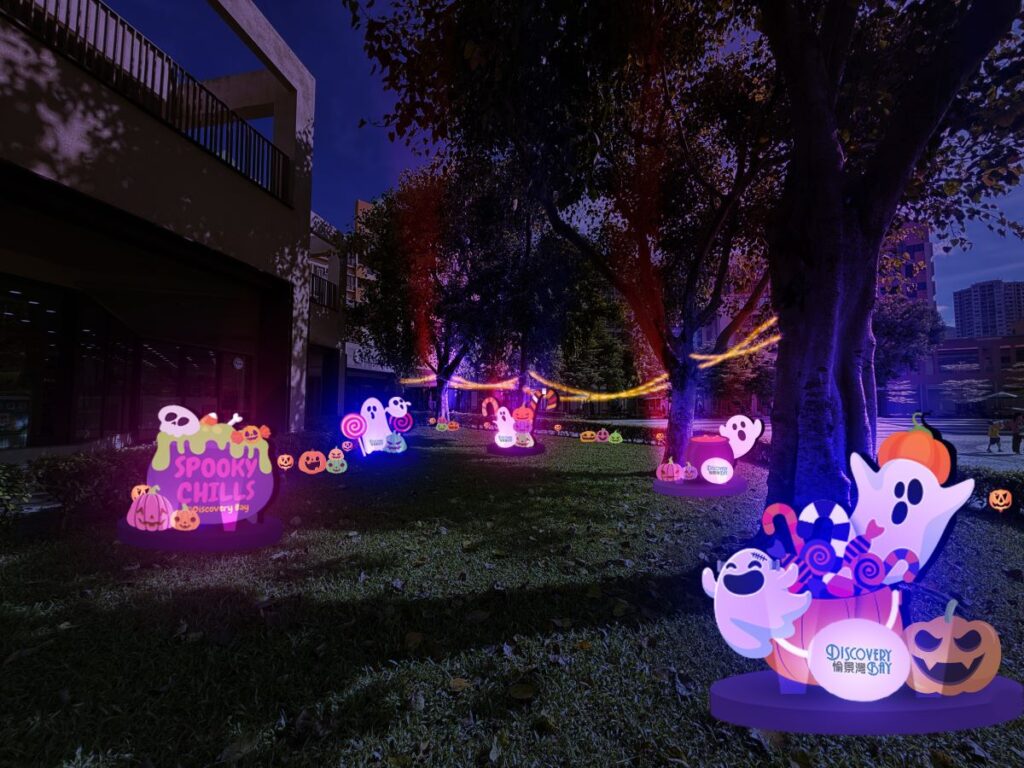 今年愉景灣將化身為「鬼魅莊園」,充滿節日魅力!穿過閃爍的發光拱門,踏進神秘草地尋找「掏蛋鬼」的蹤影,燈光裝置營造出奇幻詭異的神秘氛圍。愉景廣場及愉景北商場的噴泉亦換上萬聖節裝飾布置,鬼怪南瓜和嘩鬼精靈等齊齊登場!此外,愉景北鐘樓更見驚喜,特設八米高巨型蜘蛛網打卡位,加上七隻發光蜘蛛營造出震撼視覺效果。