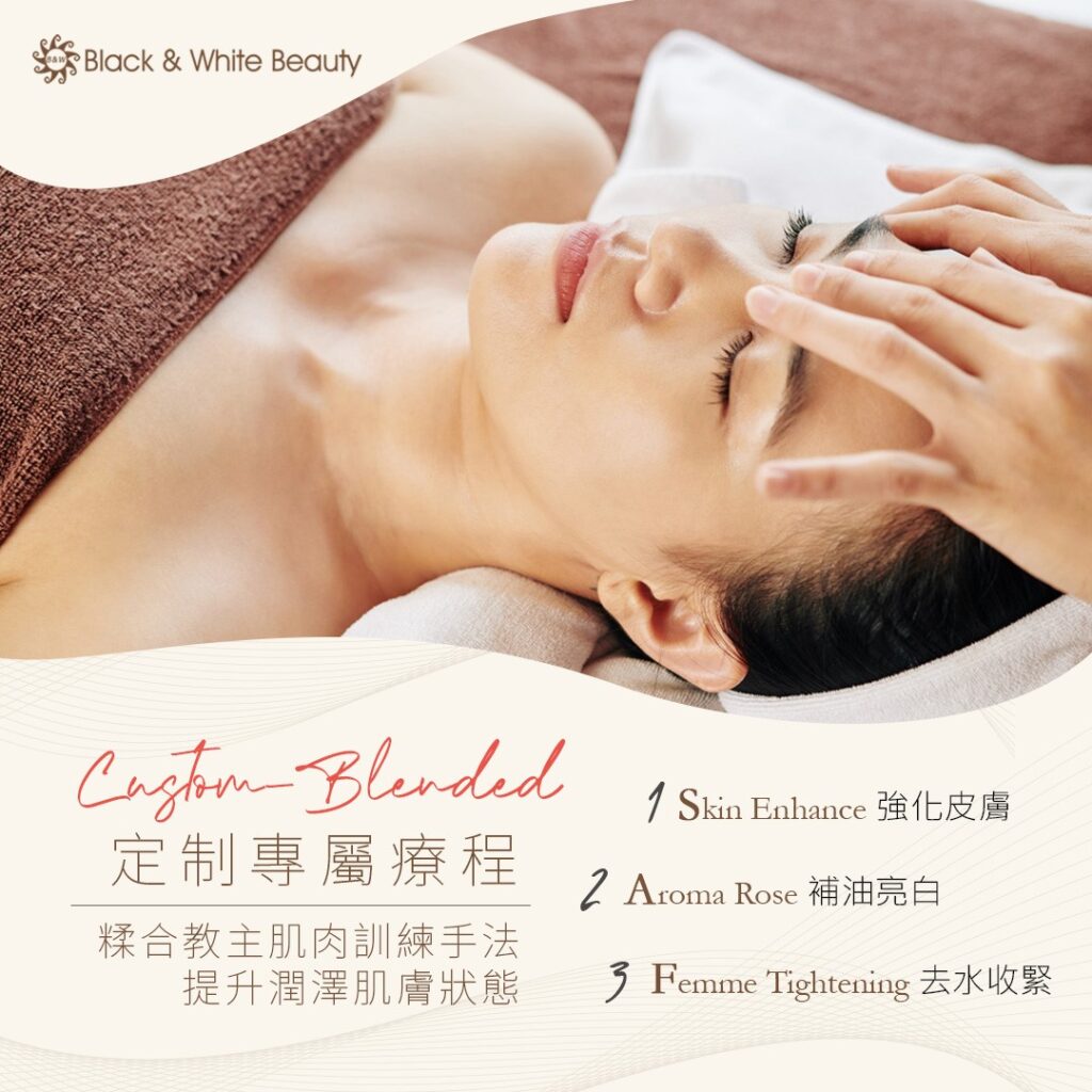 提升潤澤肌膚狀態,定制Custom-Blended療程是一種以肌肉訓練手法為肌膚緩解疲勞,提升代謝,增加血液循環。根據皮膚狀態,定制Custom-Blended療程配合不同活力滋養香薰油為肌膚補充油份,並同時以最仔細親膚的深淺均勻的力度作牽拉、柔揑、輕撫等的手法,從而達到秋收緊緻潤澤肌膚質素的養生方式。