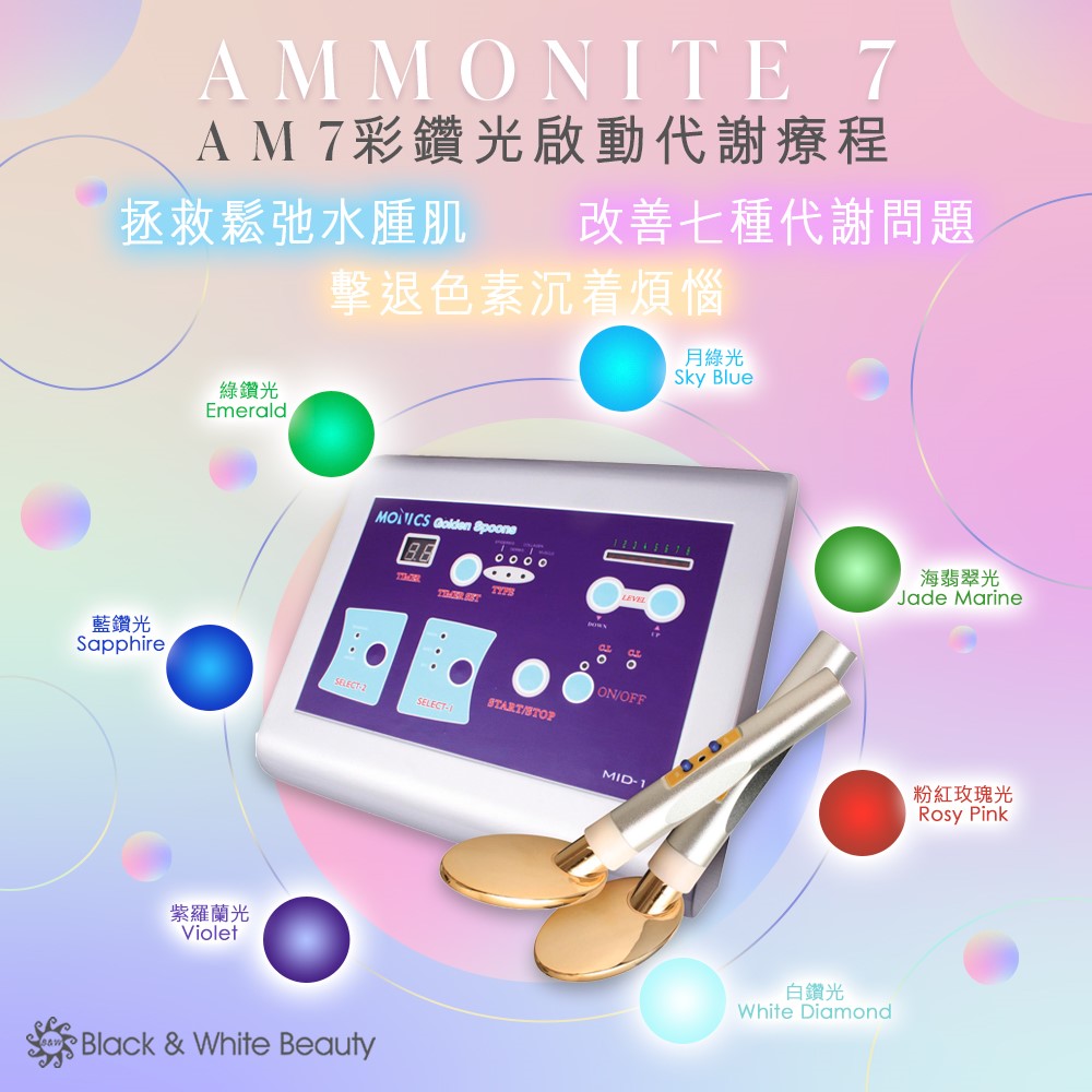 Ammonite 7 彩鑽光啟動代謝療程,可協助肌膚提高代謝效果。彩鑽光7種代謝柔光擅長啟動肌膚不同的代謝調節,屬非激活性的柔光,做到全方位改善代謝平衡。Ammonite 7當中的綠鑽光跟Custom-Blended療程配合,增強肌膚平衡脂類代謝功能,疏通毛孔,改善粉刺、暗瘡,消除油膩感,淨化肌膚。Ammonite 7其它的代謝柔光也各有所長,可因應肌膚的代謝需要配合進行,提升肌膚狀態。