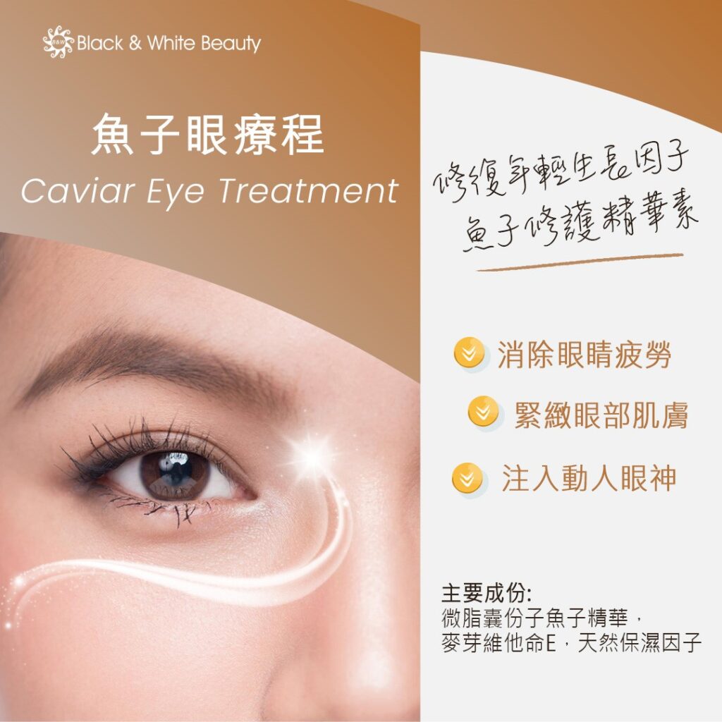 配搭Caviar Eye魚子眼部生長因子療程:運用Caviar魚子萃取精華素,有效減少眼紋、川字紋、魚尾紋,令雙眼更明亮;亦可減少醣化和羰基化所帶來的眼周色素,消除黑眼圈。