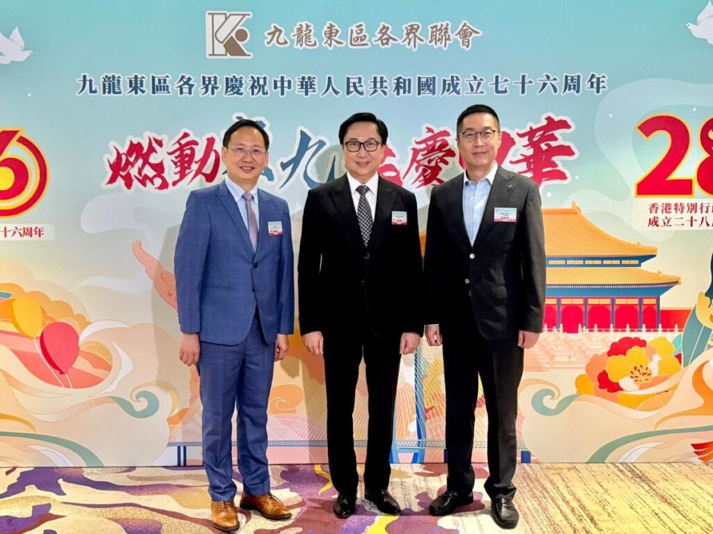(左起)觀塘中選區議員柯創盛、九龍東區各界聯會會長李誌峰及新城廣播有限公司行政總裁馬浚偉