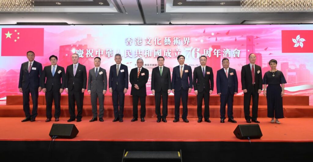 香港文化藝術界慶祝中華人民共和國成立76周年酒會,今日(9日)下午假香港金鐘JW萬豪酒店舉行。一直致力為文化藝術界貢獻的業界精英均獲邀出席,同賀國慶,出席嘉賓包括:行政長官李家超、李曙光副部長(中央人民政府駐香港特別行政區聯絡辦公室宣傳文體部副部長)、劉孝明主任(外交部駐香港特別行政區特派員公署辦公室主任)、許正中董事長(紫荊文化集團董事長)、霍震霆主席(香港文化藝術界國慶籌委會聯席主席)、區永熙主席(香港文化藝術界國慶籌委會聯席主席)等。